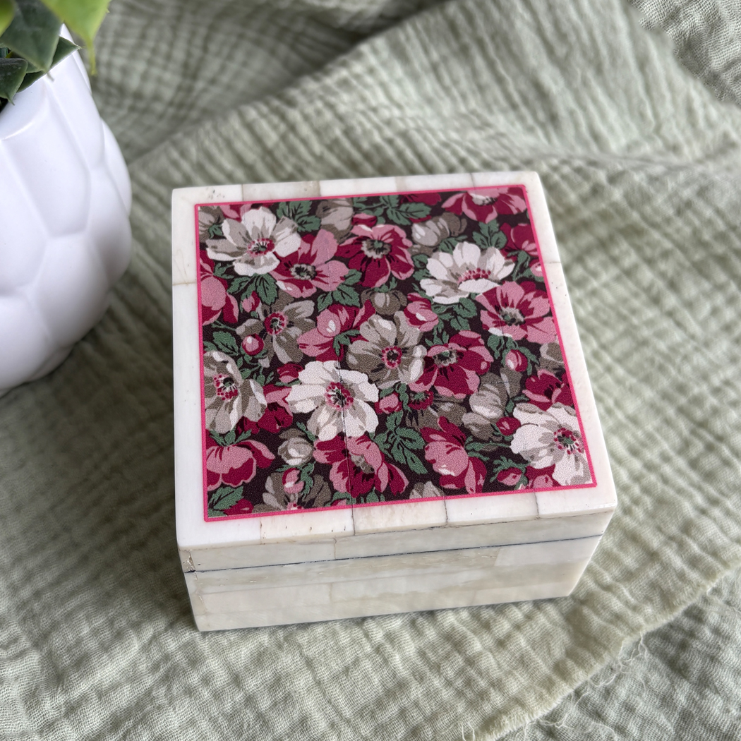 This charming little treasure or gift box brings romantic beauty to your desk, dresser, or vanity. Crafted from smooth bone tiles and printed with a vintage-inspired floral print, it’s the perfect piece for holding (or giving!) rings, earrings, keepsakes, or small desk treasures. The lid features a reproduction of an antique English floral textile, rich with shades of rose, cream, and green—an elegant nod to classic 19th-century design. Each box is individually made, giving it the look and feel of a one-of-a-kind antique find.