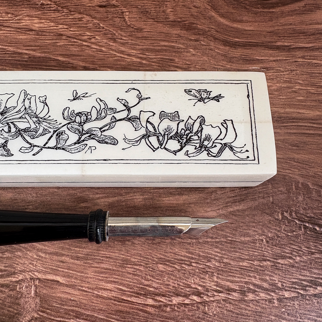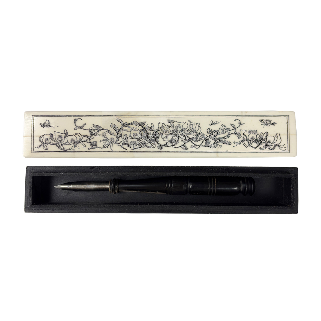 This antique-style bone pen box is a charming desk accessory for anyone who loves the look and feel of calligraphy and old-fashioned writing. The box is decorated with a vintage-inspired art nouveau flowering vine print, giving it the character of an antique keepsake. Inside is a traditional dip pen with a horn handle and stainless steel nib, ready to be used for calligraphy, handwritten notes, sketching, or simply displayed as a conversation piece.